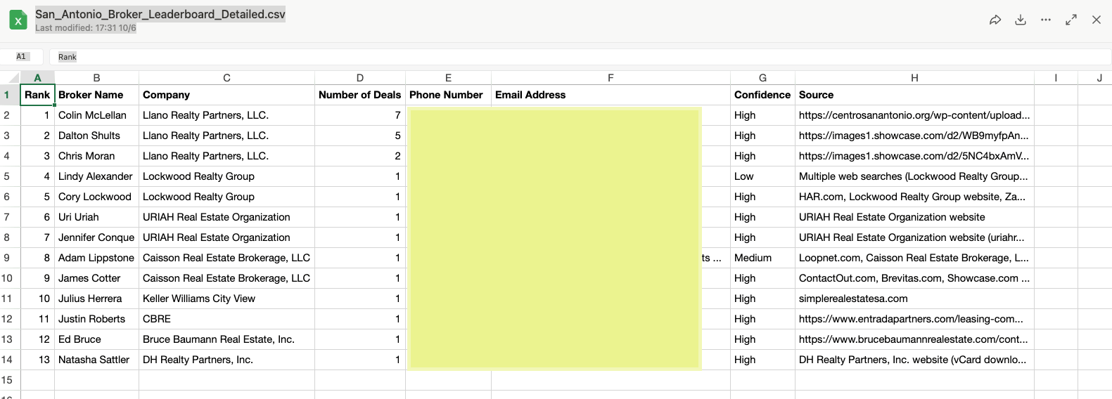 "Create a leaderboard of the most active [leasing/sales] brokers in [CITY] based on these recent commercial transactions. Include broker names, phone numbers, and email addresses."Upload your screenshots.